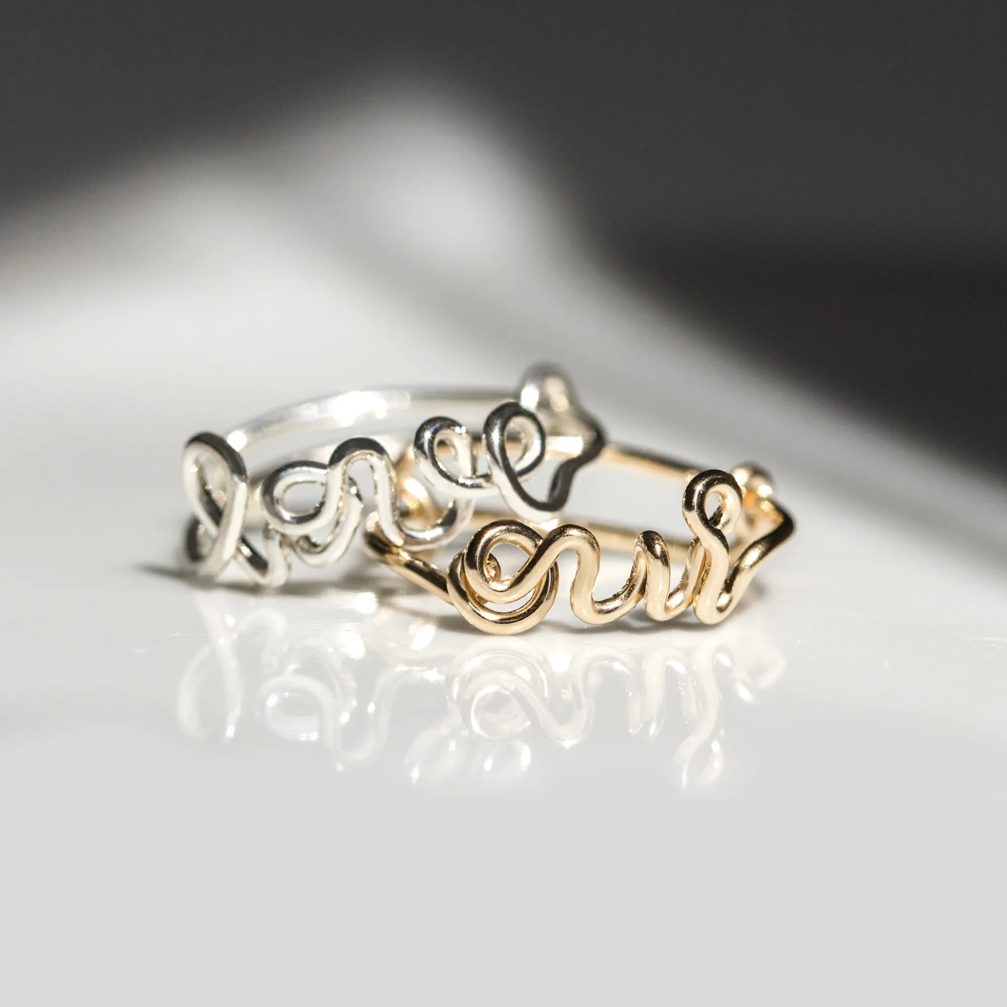 Une bague délicatement sculptée à la main par nos talentueux artisans. Fait main, lettre par lettre à partir d’un unique fil en métal précieux. Un prénom, un mot fétiche… Vous pouvez personnaliser jusqu’à 4 caractères. Un cadeau plein de sens, unique et original.