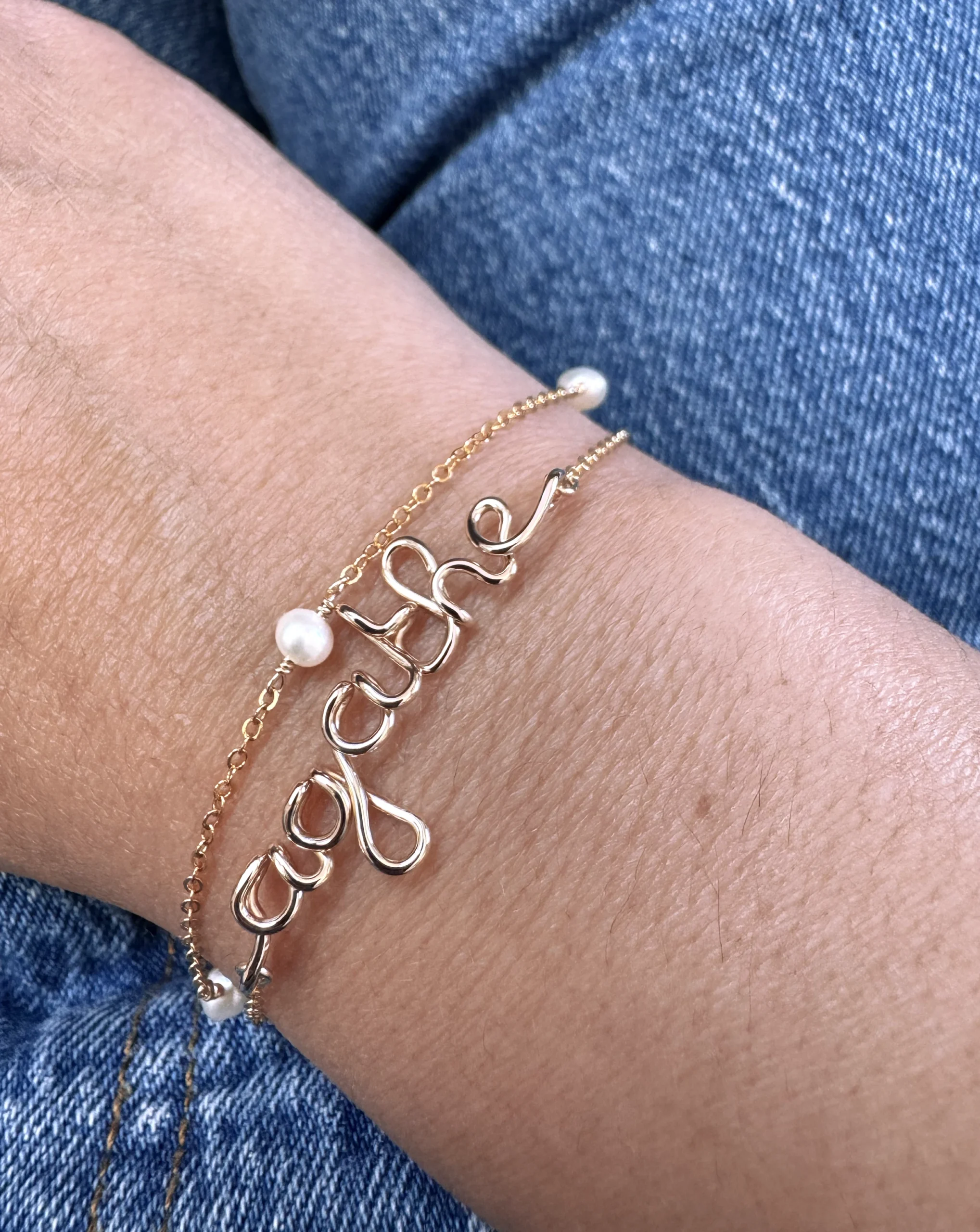 Un bracelet délicatement sculpté à la main par nos artisans. Lettre par lettre, un unique fil en métal précieux prend forme, puis est monté sur une fine chaîne ajustable pour épouser parfaitement votre poignet. Un prénom, un mot fétiche, une date…
